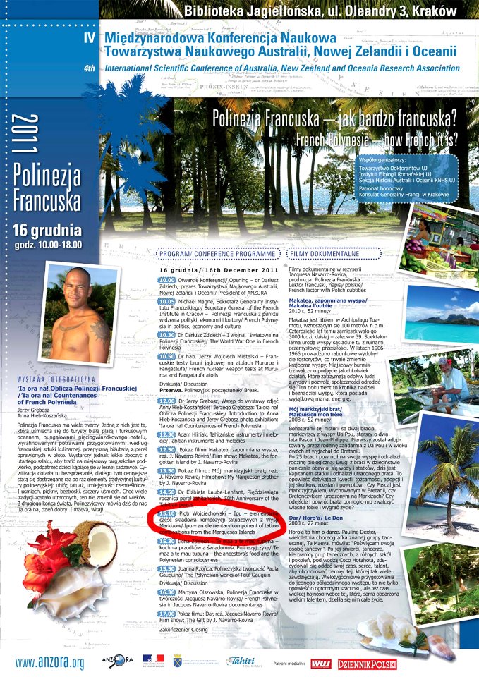 W piątek, 16 grudnia w Bibliotece Jagiellońskiej w Krakowie odbędzie się IV Międzynarodowa Konferencja Towarzystwa Naukowego Australii, Nowej Zelandii i Oceanii „Polinezja Francuska – jak bardzo francuska?”. W programie masa ciekawych wykładów, które kompleksowo ukażą kulturę Polinezji. Będą zagadnienia z dziedziny polityki, ekonomii oraz życia codziennego, m.in. tradycja tatuowania ciała, muzyka czy kuchnia. Piotr Wojciechowski, wydawca magazynu „Tatuaż – Ciało i Sztuka”, tatuator i właściciel gliwickiego studia D3XS, poprowadzi wykład „Ipu – elementarna część składowa kompozycji tatuażowych z Wysp Markizów”.