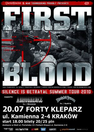 W najbliższy wtorek (20 lipca 2010) w krakowskim klubie Forty Kleparz wystąpi zespół First Blood. Jest to kapela, która początkowo była pobocznym projektem gitarzysty Terroru. Po dobrym przyjęciu na scenie hardcore Carl odszedł z Terroru i stał się etatowym wokalistą w First Blood. Do tej pory zespół wydał jeden album „Kilafornia”. 20 lipca w Krakowie Carla i spółkę supportować będą Austriacy z Bloodshed Remains (gdzie Carl wystąpił gościnnie na najnowszej płycie) oraz nasi bliscy południowi sąsiedzi, Abhorrence z Bratysławy.