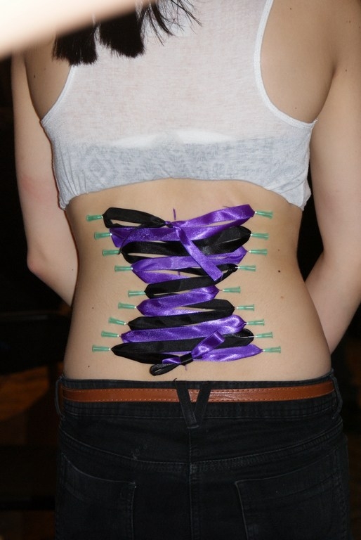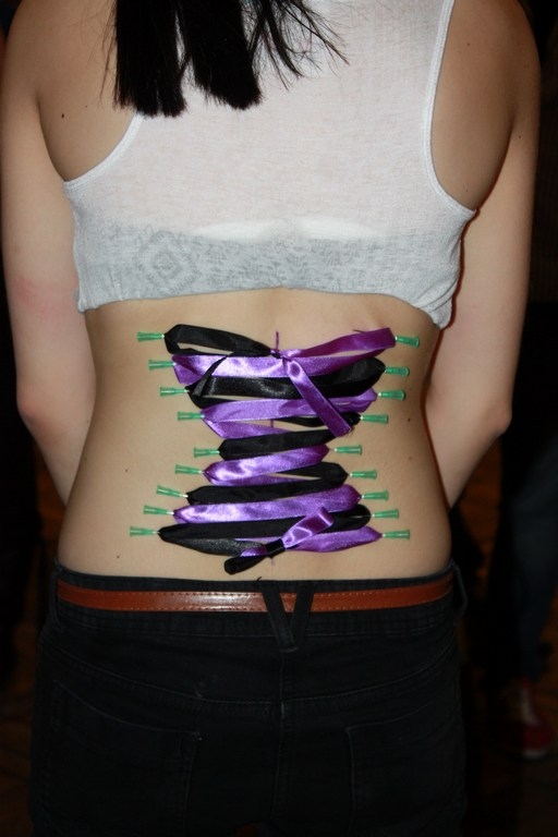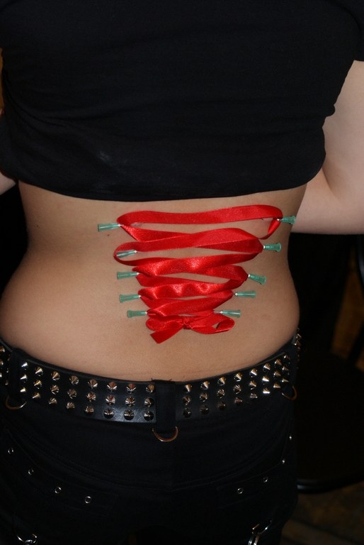 Tego dnia atrakcją był też gorset, tym razem wykonywany w boksie Street Tattoo. Tym razem wbiliśmy z Morbidem 18 kolczyków. Modelka była bardzo dzielna. Nie był to jej pierwszy gorset i przypuszczam, że też nie ostatni! Kształt gorsetu przypominał trzy romby, nachodzące na siebie nawzajem. Efekt możecie zobaczyć na zdjęciach.