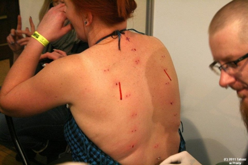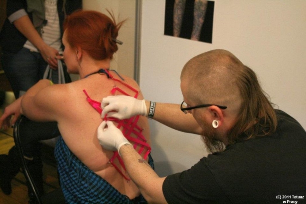 Tego dnia atrakcją był też gorset, tym razem wykonywany w boksie Street Tattoo. Tym razem wbiliśmy z Morbidem 18 kolczyków. Modelka była bardzo dzielna. Nie był to jej pierwszy gorset i przypuszczam, że też nie ostatni! Kształt gorsetu przypominał trzy romby, nachodzące na siebie nawzajem. Efekt możecie zobaczyć na zdjęciach.